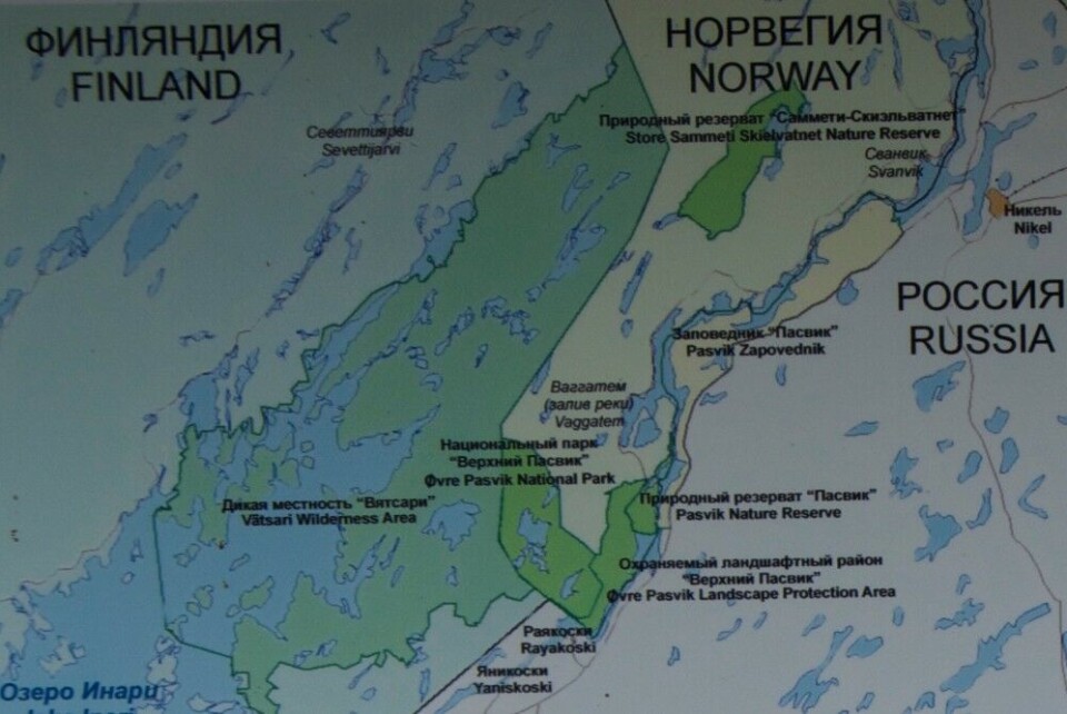 At the ribbon cutting ceremony, both Minister of Natural Resources and Environment Sergey Donskoy and President Putin’s special envoy on environment Sergey Ivanov were introduced to Pasvik Nature Reserve [zapovednik] and shown a big map of the area. The map, however, only included the part of the nature reserve that is on the east side of the Pasvik River.