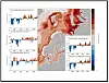 The red colors illustrates temperatures at the sea surface, and are measurements that includes depth down to 200 meters. The measurements show more stable temperatures deeper into the ocean.